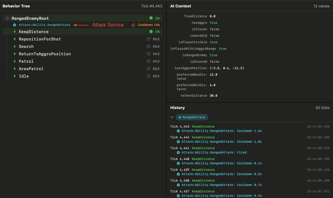 Because services report their status ("Fired", "Cooldown 2.3s", "Chilled"), the standalone debugger app I built can show attack state right alongside the behavior tree visualization. You can see exactly when an enemy is attacking, when it's on cooldown, and when a chill effect is slowing its attack rate. That last part was a fun one. The AttackService respects a chill multiplier, so ice-based builds in the game make enemies attack slower without stopping them entirely.