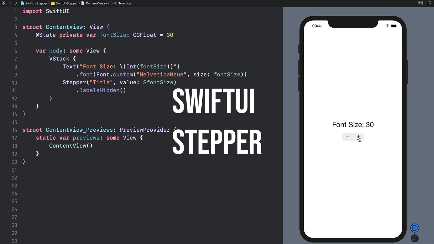 There are 3 things we’ll need: A state property to keep track of the font size, some text, and our Stepper. So to start out add a state property for the font size and put some Text in a VStack (this is so we can add the Stepper right below the Text).